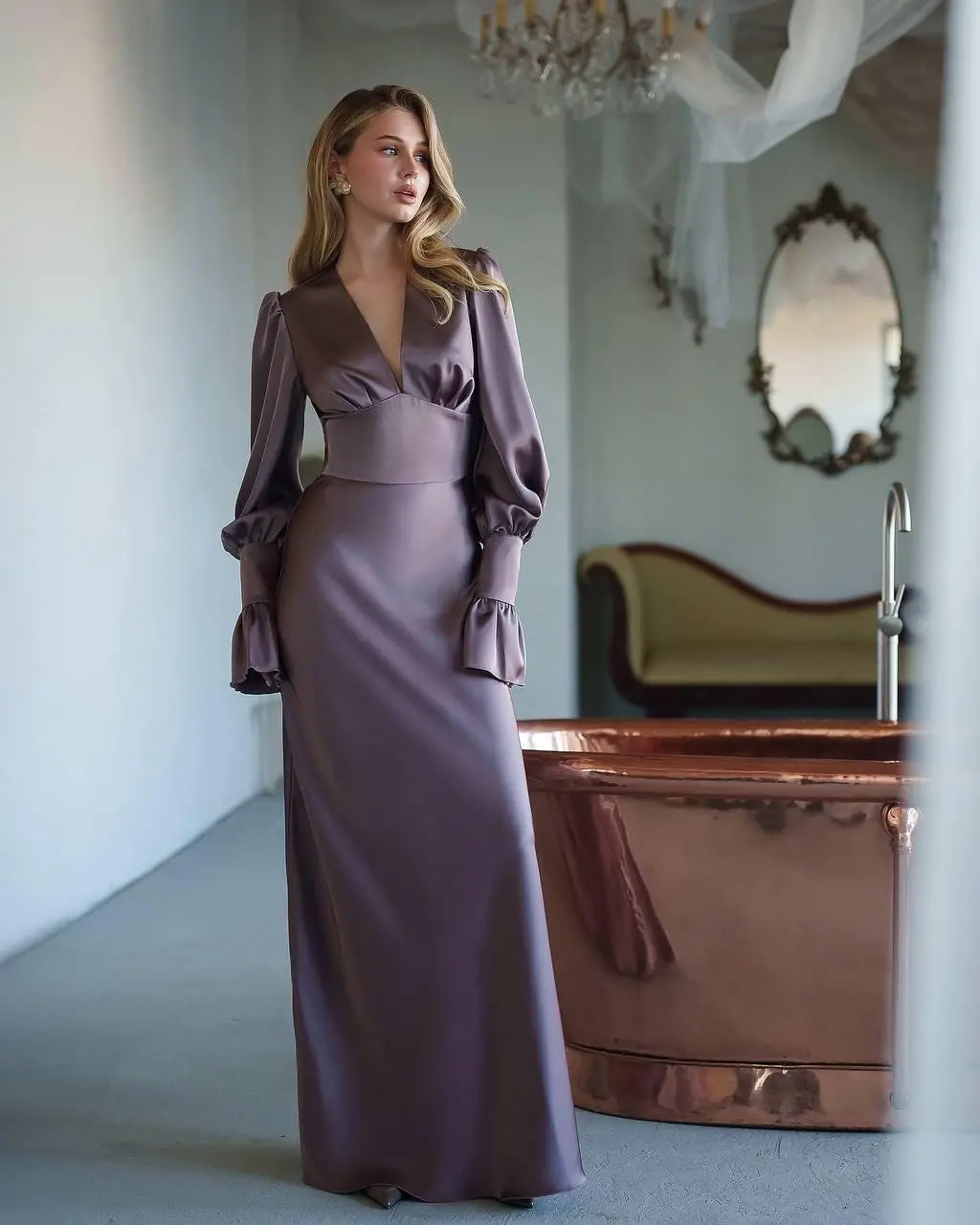 Elegant satin maxi dress with puff sleeves — timeless femininity in every detail.