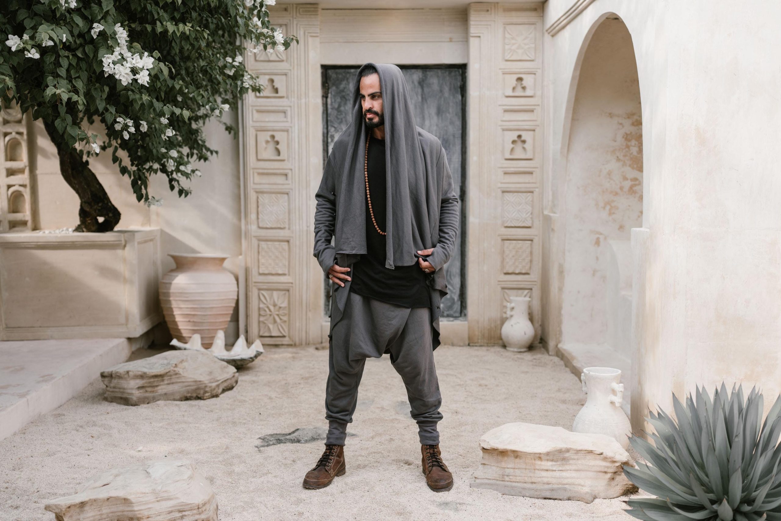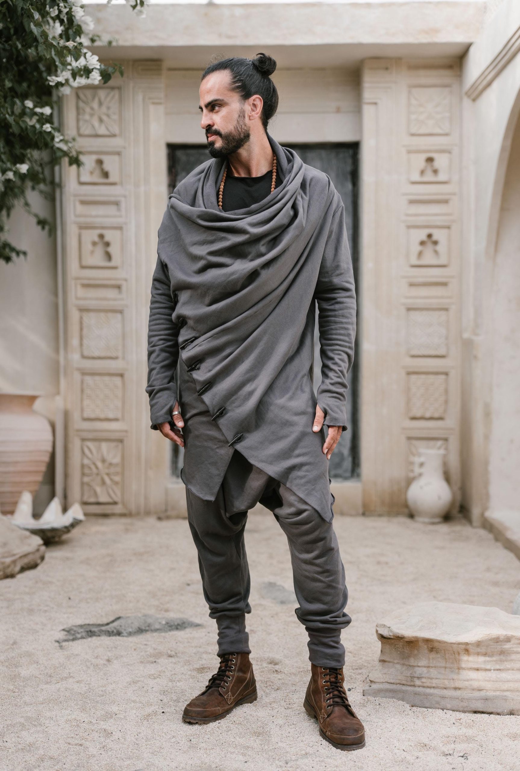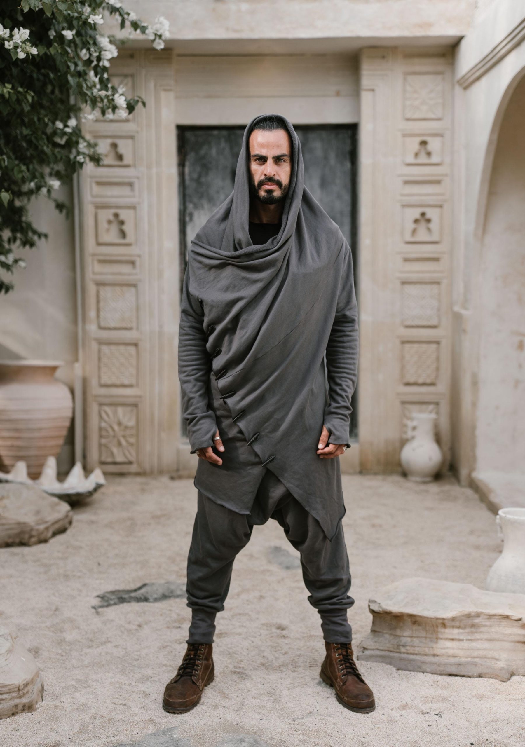 Multiple button attachment variations enable you to adjust the look of this hoodie to suit different occasions. Use it open as a stylish and elegant cardigan, or close it up for a hooded Bedouin look. You can play with many variations with the buttons.