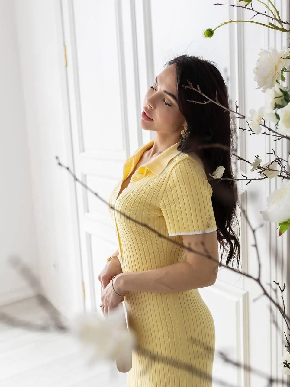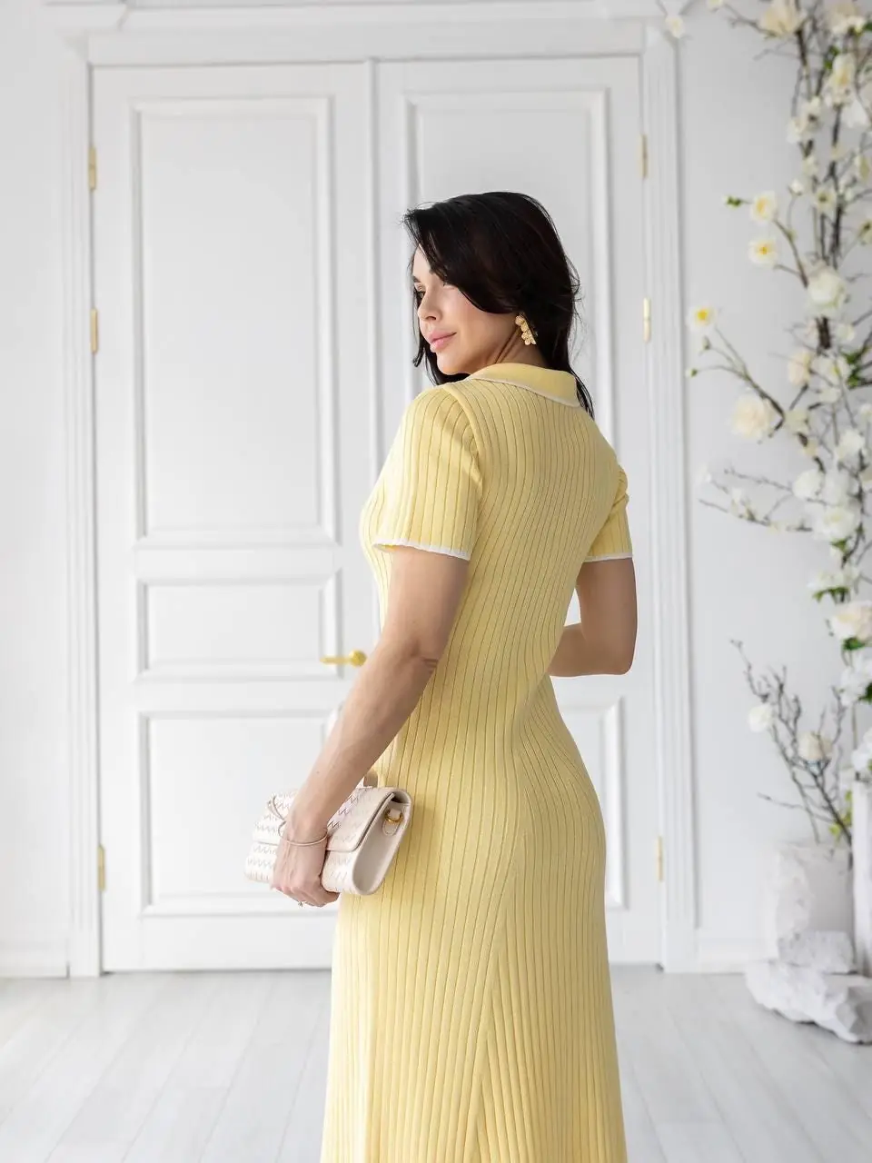 This soft and feminine yellow ribbed knit midi dress is your new go-to for sunny days. Crafted from breathable cotton with a flattering fit and flare silhouette, it features a classic polo collar, button-front detail, and a stylish ribbed texture. The stretchy machine-knit design makes it suitable for a wide range of body shapes.